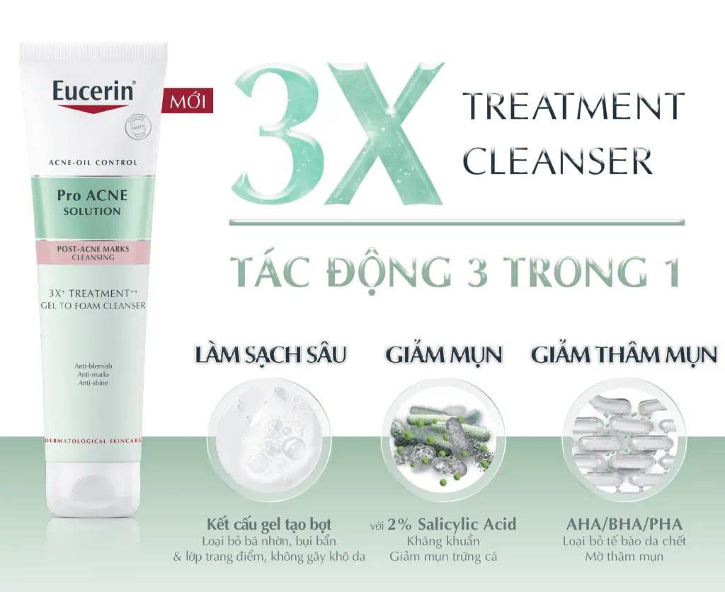 Thực tế hiện nay, các sản phẩm sữa rửa mặt trên thị trường mới chỉ dừng ở mức làm sạch đơn thuần, hoặc không đủ khả năng làm sạch sâu hay đáp ứng tiêu chí dịu nhẹ cho làn da. Thấu hiểu nhu cầu cũng như sự mong mỏi của các tín đồ làm đẹp toàn thế giới, thương hiệu dược mỹ phẩm nổi tiếng đến từ Đức Eucerin đã cho ra đời sữa rửa mặt giảm mụn đầu tiên Eucerin Pro Acne 3X Cleanser – với khả năng làm sạch sâu nổi trội mà không gây khô da. Sản phẩm đã được kiểm chứng lâm sàng về hiệu quả làm sạch dầu thừa, bụi bẩn và mức độ dịu nhẹ.